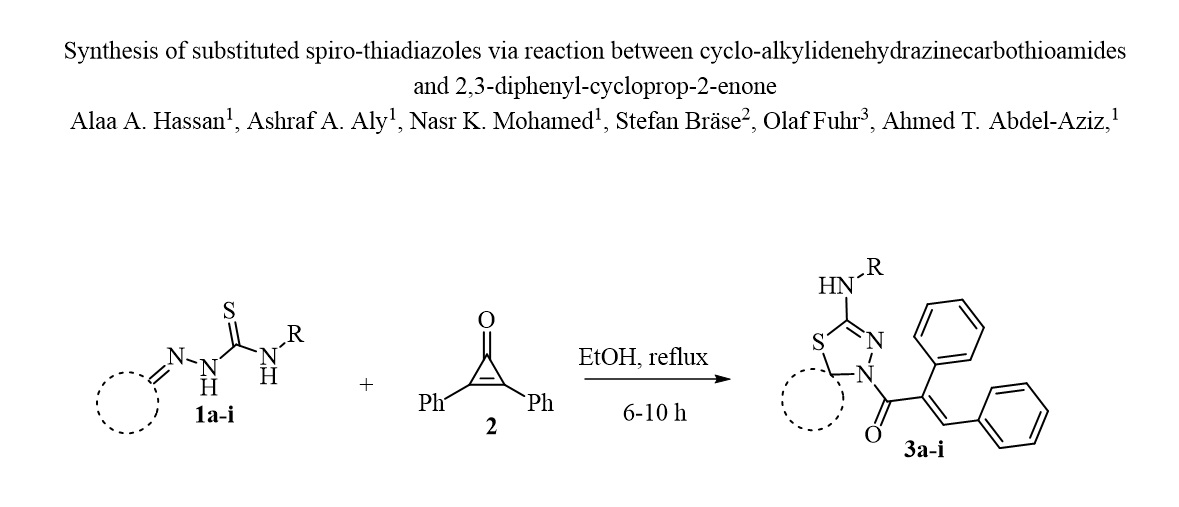Alaa A Hassan. "Synthesis of substituted spiro-thiadiazoles via reaction between cyclo-alkylidenehydrazinecarbothioamides and 2,3-diphenyl-cycloprop-2-enone", Advances in Basic and Applied Sciences, 4, 1, 2025, 65-71. doi: 10.21608/abas.2025.379208.1063